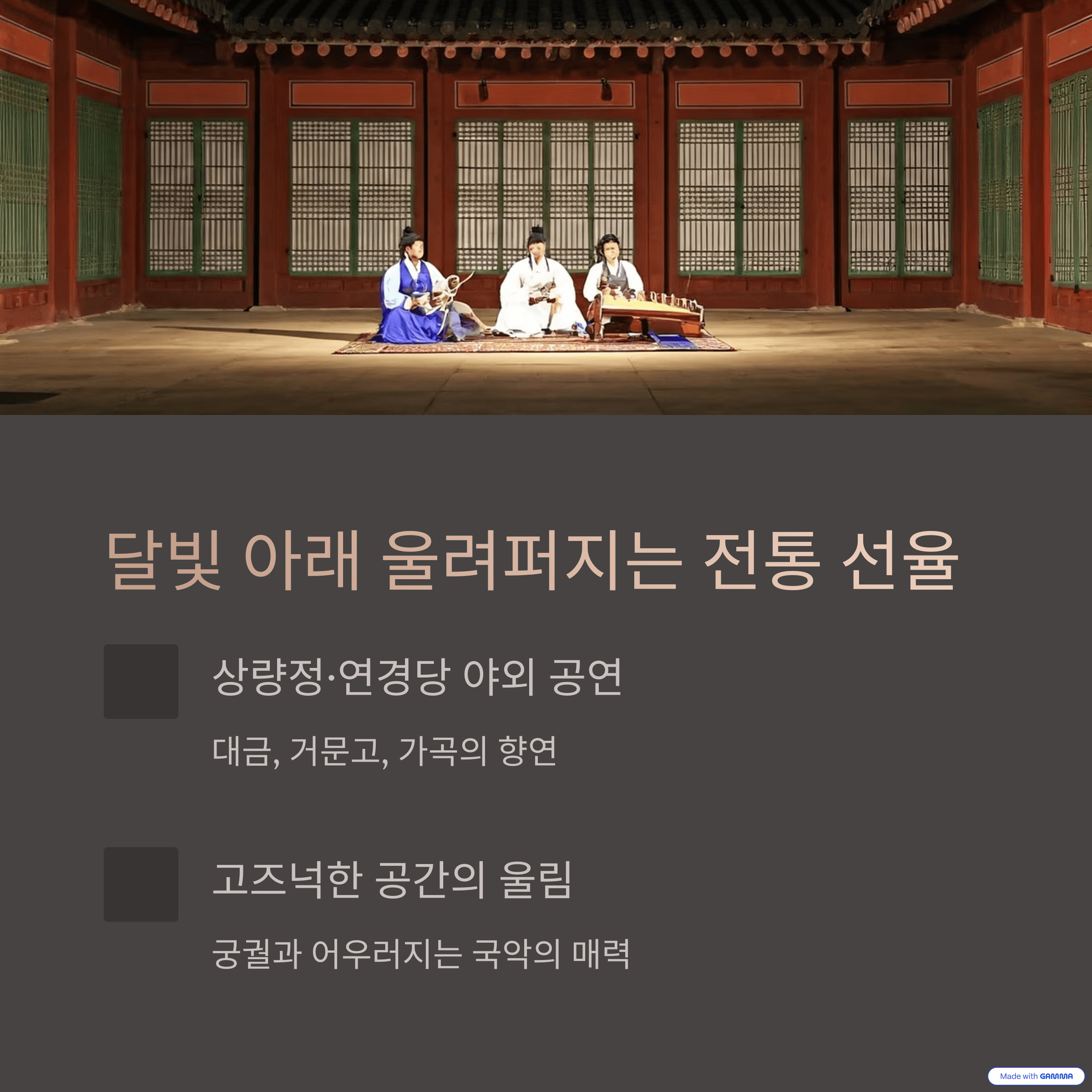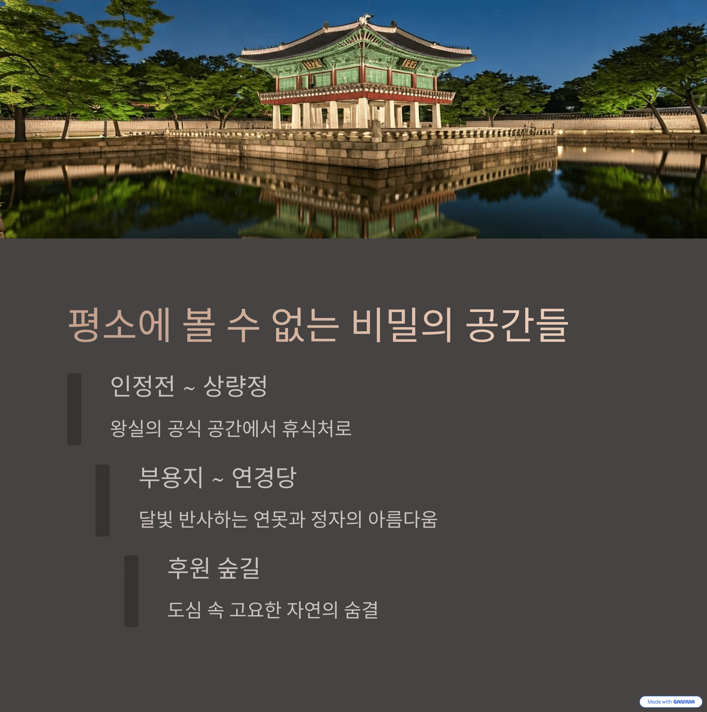 창덕궁 후원은 낮에도 아름답지만, 야간에는 그 진가가 폭발합니다. 고즈넉한 분위기, 은은한 조명, 그리고 잔잔한 해설이 어우러지면서 마치 조선시대 왕실 정원을 걷는 듯한 느낌이에요.